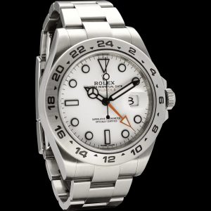 Dial diameter: 42 mm. Brushed and polished 904L stainless steel case. Brushed 904L stainless steel Oyster bracelet. 42mm = 1 5/8�� case, 6.5�� adjustable bracelet. Inlet size: 21 mm. White dial. Dot and index hour markers. Fixed stainless steel bezel with 24-hour display. Orange 24 hour hand. Cyclops lens date function. Self-winding movement. GMT Second time zone function. Independent quick setting of the hour hand. Stop seconds function for precise time setting. Luminous hands and hour markers. Tighten the crown and sturdy case back. Oystersteel folding Oysterlock safety clasp with easylink 5 mm comfort extension. 48 hours power reserve.