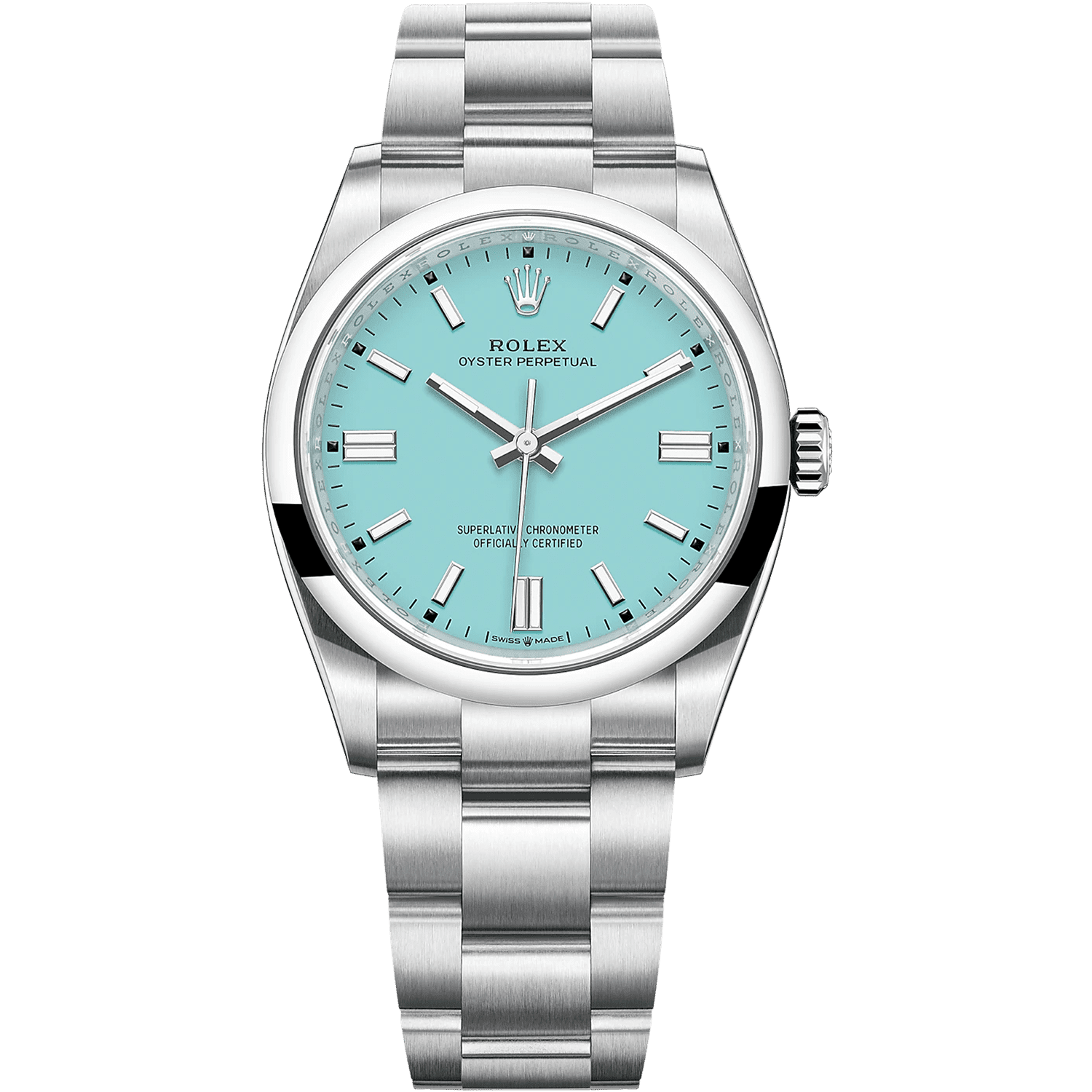Turquoise blue dial. Dial diameter: 36 mm, 904L stainless steel. Monocoque midshell. Screw-down case back and winding crown. Dome bezel. Tighten. Twinlock double waterproof system. Scratch resistant sapphire crystal. Water resistant to 100 meters/330 feet. Permanent mechanical self-winding movement. Functions: central hours, minutes and seconds. About 70 hours of power reserve. Flat three-piece link bracelet in Oystersteel. Folding Oysterclasp with Easylink 5mm comfort extension.